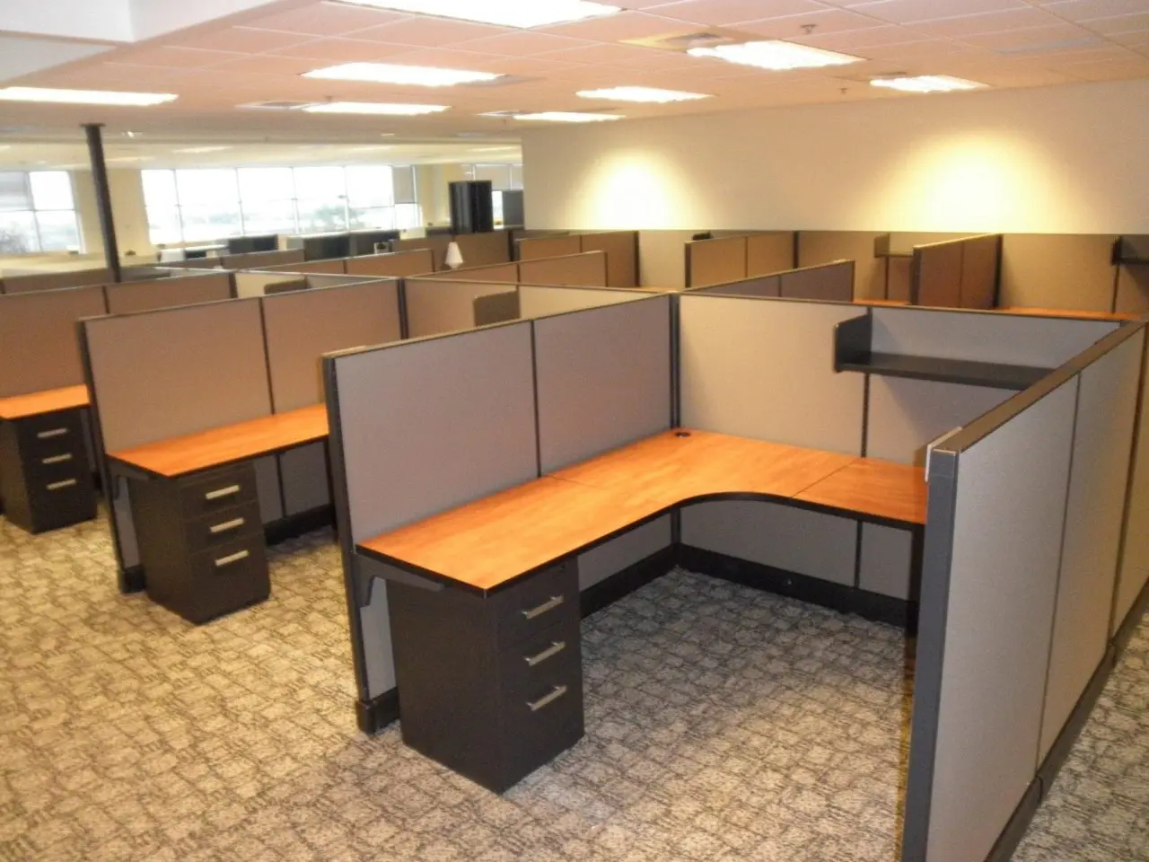 - Cubicles feature a 36″ open shelf and a 3-drawer locking file unit that handles hanging files & personal items