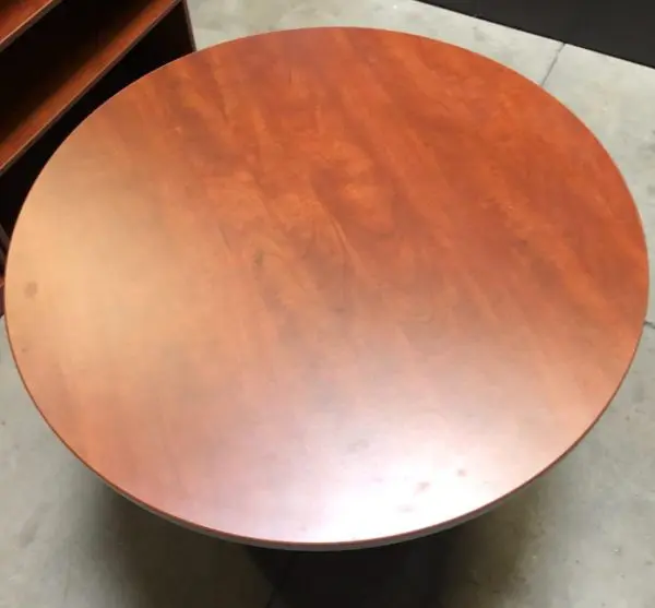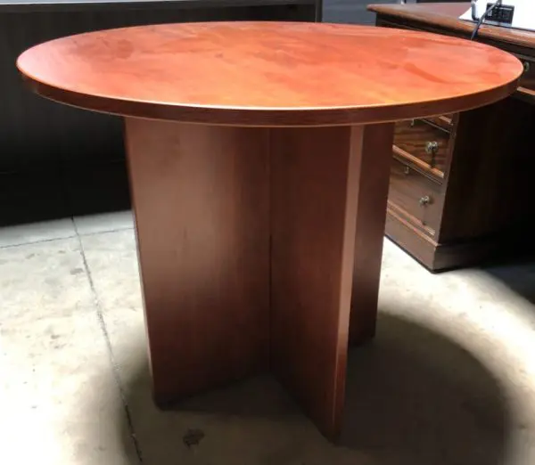 This cherry round table is a beautiful addition to your office or store space and its cross base provides a sense of classiness.