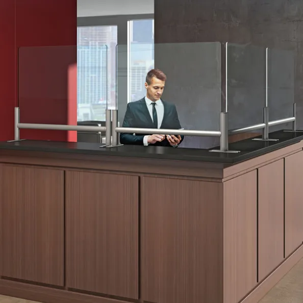 Introducing the Office Sneeze Shield – Terrace. This acrylic sneeze guard creates a clear barrier between your employees and customers, helping to reduce the spread of airborne germs. These shields are held by lightweight silver aluminum frames and best of all, they can be mounted with or without drilling. Add a layer of safety to your business without changing your current decor.