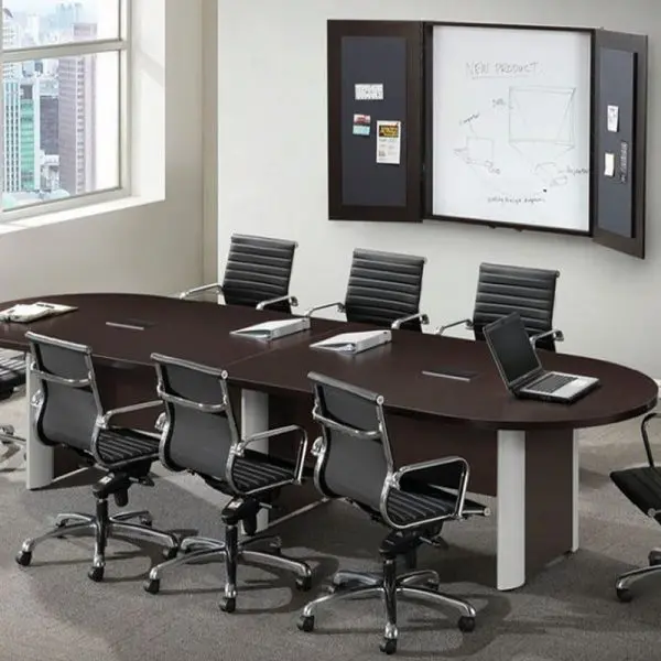 If you’re looking for a durable and stylish boardroom table for your meetings, you’ve found it. This racetrack conference table with a silver accent base is available in your choice of length and your choice of color. In addition to being priced right, it features a scratch and mar-resistant coating that will look new for years to come. The centerpiece of your meeting room is ready for delivery or pickup.