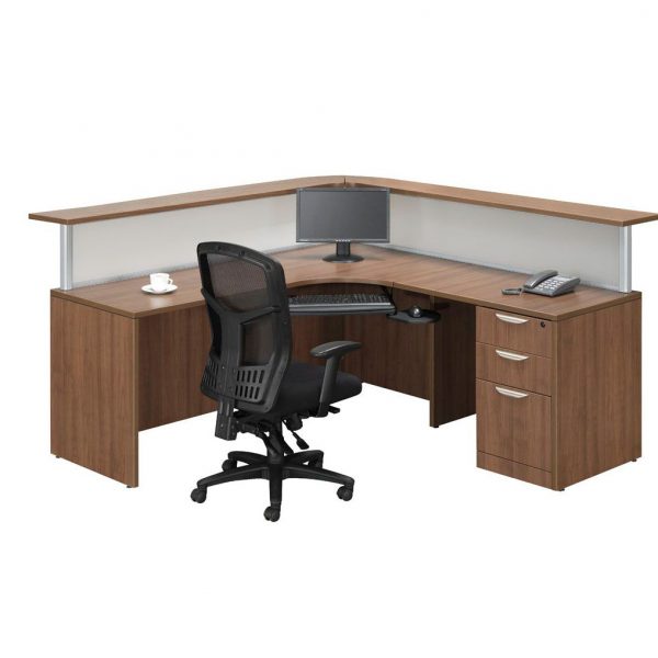 Our Reception Desk with Dual Counter Tops and Filing Cabinets is perfect for the employee who is responsible to greet your clients and complete tasks. It features two counter tops for transactions, ample work space behind frosted privacy panels and a locking filing cabinet for out of sight storage. This desk can also be used for individual employees who need partitions between their workstations.