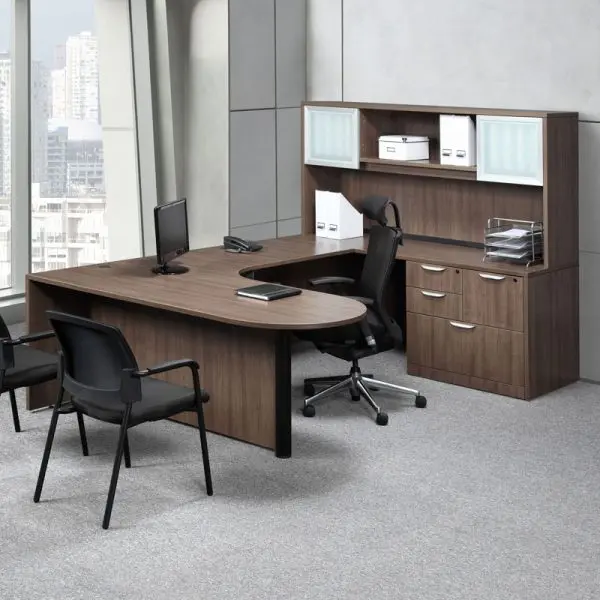 U-Shape Desk with Overhead Storage and Filing Cabinets