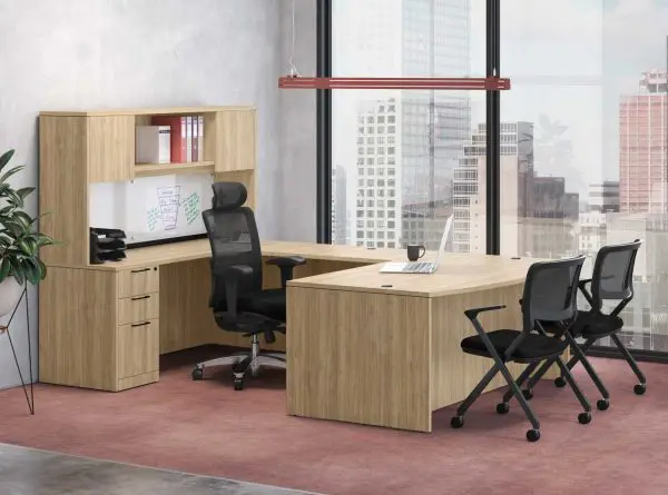 This U-Shaped Desk, Credenza and Files is a complete workstation for the busy executive. Workspace surrounds the user while storage is available overhead and below the desk. Keep track of your to-do list on the magnetic whiteboard. Chairs shown are sold separately.