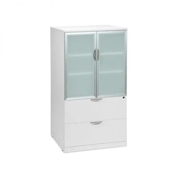 This White Storage Cabinet with Glass Doors is a great space-saving solution for a home or work office. The lower portion is a legal 2-drawer lateral file. The upper portion has opaque glass doors for a modern look and 3 shelves to store supplies, small electronics and more. Keep your work area neat and tidy with this great piece of office furniture.